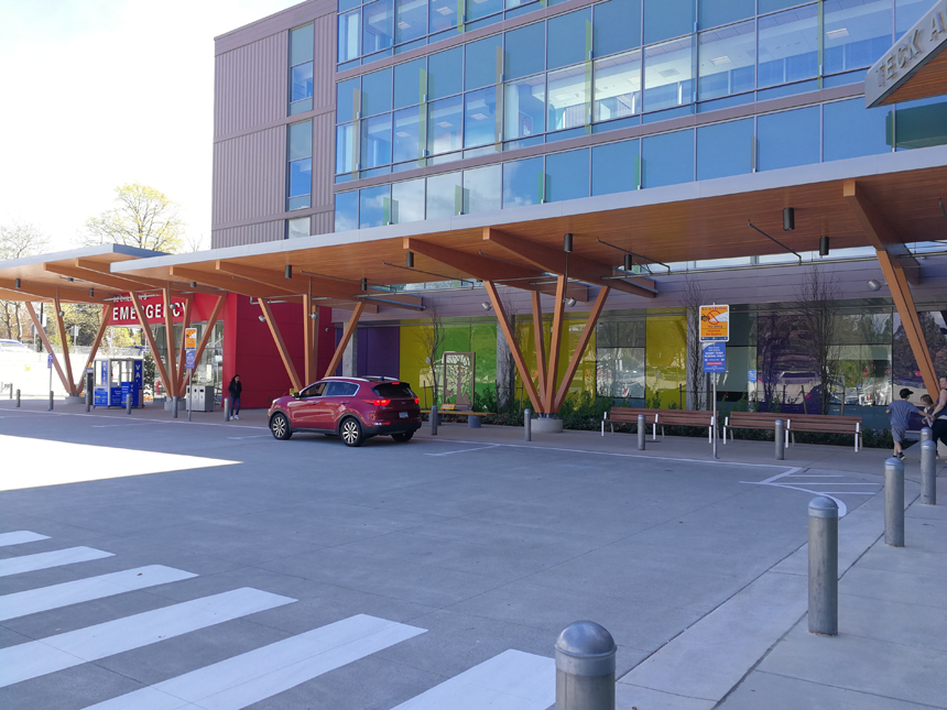 急诊中心设置了多个出入口,入口前坪实行人车分流,还设计了无障碍通道。