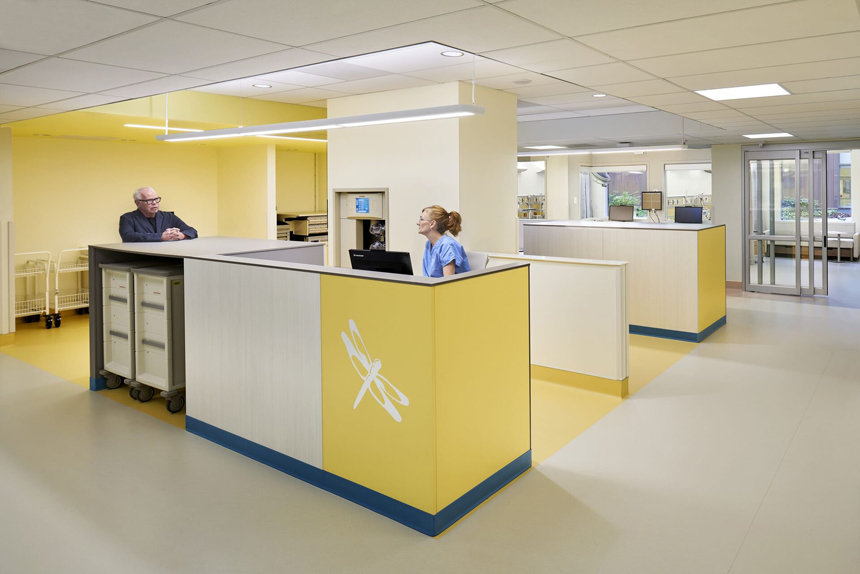 设计目标是通过优化通道和流程,并结合循证设计原则(如自然光、景观、屋顶花园、艺术、LED 照明)来改善护理服务。